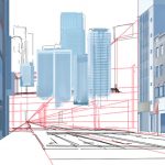 前回「ビルの描き方」を解説したので、その続きとして道路を描いています。当たり前ですが、こういったビル街の道路といえばバッチリ舗装された道路になります。歩道だったり、横断歩道や停止線・ガードレールなどもありますね。これらを描いていきたいと思います。