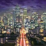 中間距離にビルを描き足しました。直線の多い近代風のビルにすればそこまで描く手間はありませんし、これだけでもぐっとビルが密集しているように感じられるようになりました。