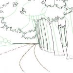 アタリが取れたので清書していきます。まずは手前の樹木から。カメラに近いほうの樹木の葉っぱは一枚一枚丁寧に描きます。少し奧に位置している葉っぱはタッチをすこし緩くして描きます。